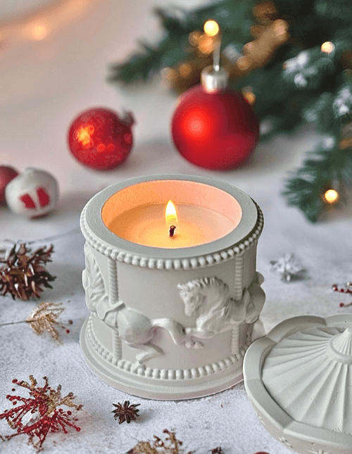 Turnată manual din ceară naturală de cocos și soia, lumânarea oferă o ardere curată în recipientul ceramic în formă de carusel, un accent decorativ rafinat, perfect pentru iarnă.