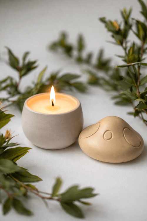 O lumânare din ceară de soia cu cocos (80 g), turnată într-un recipient din beton cu design organic, unde estetica minimalistă întâlnește funcționalitatea. Suprafața minerală, mată, contrastează cu flacăra caldă și creează un accent contemporan. Ceara naturală arde curat și uniform, iar obiectul rămâne o piesă de design chiar și după consumarea lumânării.