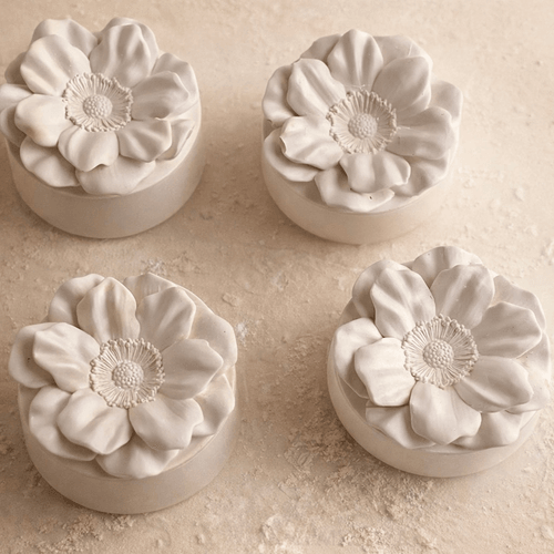 Turnată dintr-un amestec natural de ceară de soia și cocos, lumânarea oferă o ardere uniformă și o lumină caldă care completează experiența olfactivă. Recipientul ceramic alb, cu capac floral sculptural, transformă fiecare aprindere într-un mic ritual vizual.